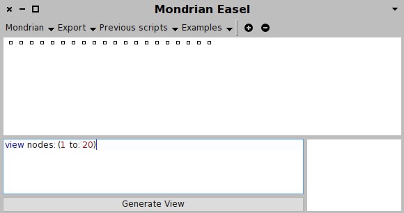 우리는 먼저 가장 간단한 방식, 즉 easel을 이용해 Mondrian을 사용해볼 것이다. easel을 열기 위해선 World 메뉴("Mondrian Easel" 엔트리를 포함할 것이다)를 이용하거나 아래 표현식을 실행한다.