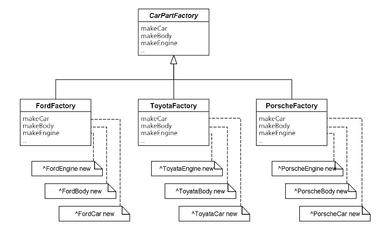 먼저 패턴 구현을 CarPartFactory 라는 추상 팩토리 클래스를 정의하는것부터 시작하자. 클래스는 "구체적 클래스를 지정하지 않고 관련 객체군 또는 종속 객체군을 생성할 수 있는 인터페이스를 제공한다" ('의도' 단락 참조). 또한 클래스는 makeCar, makeEngine, makeBody와 같은 추상적 Product-creation 메서드를 정의한다. 메서드까지 정의하고 나면 사용자는 제품군마다 하나씩의 팩토리의 구체적 하위클래스를 정의한다. 각 하위클래스는 적절한 부품을 생성하고 반환(return)하기 위해 제품 생성 메서드를 재정의한다. 따라서 사용자는 Object 아래에 다음과 같이 새로운 하위계층구조를 추가한다.