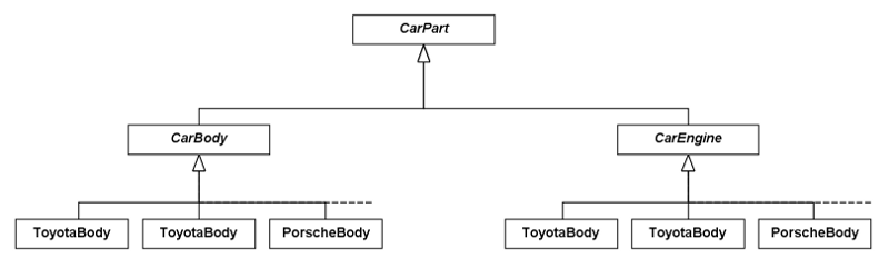 첫째, 여기에 컴포넌트 하위부품(subpart)부터 하나씩 시작해서 제품을 구축하는 목적을 가진 애플리케이션이 하나 있다. 이 애플리케이션을 이용해 차체, 엔진, 변속기, 차 내부로 나누어지는 자동차를 구현할 수 있다. 둘째, 이 애플리케이션에서는 단일 제품의 컴포넌트가 동일한 부품군, 즉 세트로 된 부품이어야 하며, 예를들어 Ford(Ford) 자동차의 경우는 Ford사에서 만든 엔진과 변속기를 필요로 한다. 이러한 부품은 Ford 군(계열)에 속한다고 할 수 있다. 셋째, 우리는 Ford 부품, Toyota(Toyota) 부품, 포르쉐(Porsche) 부품 등 여러 종류의 부품군을 가지고 있다. 해당 클래스는 클래스 계층구조(class hierarchy)를 통해 적절한 하위계층구조(subhierarchy)로 뻗어 나간다: 엔진은 CarEngine 하위계층구조에, 차체는 CarBody 계층구조에 속하게 된다. 따라서 우리는 이 애플리케이션이, (1) 하나의 부품군으로부터 자동차 컴포넌트를 쉽게 검색하고 부품군들 간의 오류를 허용하지 않으며(Toyota 엔진이 Ford 자동차에 사용되는 경우가 없도록), (2) 모든 부품군에 있어 통일된 부품 검색 코드를 사용할 수 있도록 하는 방법이 필요하다. 이런 경우에 추상 팩토리 패턴을 사용하면 두 가지 조건을 모두 충족시킬 수 있다.