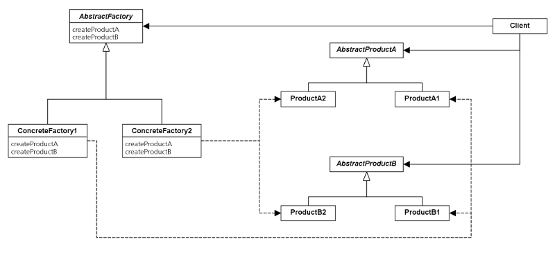 관련 객체 또는 종속 객체군을 작성하기위한 인터페이스를 제공한다. 클라이언트는 구체적인 클래스를 지정하지 않고도 추상적인 방식으로 모든 제품군의 제품을 만들 수 있다.