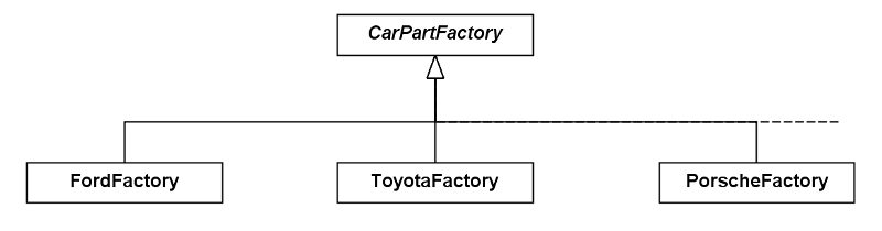 예제로 보여 준 애플리케이션에서 CarPartfactory 는 모든 자동차 factory 에 대한 인터페이스를 정의한다. 대안 팩토리는 CarPartFactory 의 하위클래스로 정의되며, 각 대안 팩토리는 적절한 부품 생성 메서드를 오버라이드한다. 가장 간단히 말해 바닐라 구현에서 이러한 메서드 각각은 다음과 같이 인스턴스화하고 반환하기 위해서 클래스를 하드코딩(hard-code)한다.
