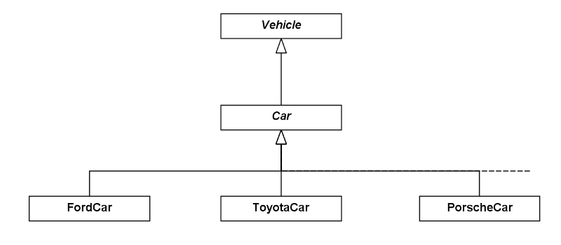 Vehicle 과 CarPart 는 Object 의 하위클래스이다. 물론 이러한 클래스 구조는 여러모로 지나치게 단순화시킨 구조이다. Ford와 같은 자동차 회사에서는 자동차, 차체, 엔진, 심지어 엔진 유형까지 (예: 카솔린 구동식 또는 디젤 엔진) 여러 유형의 모델이 있다. 따라서 실 세계의 자동차 모델에는 여기서 나타낸 것보다 추상화 단계가 더 많다. 하지만 이 책의 패턴 설명은 최대한 단순하고 쉽게 관리하는 것을 목적으로 한다.
