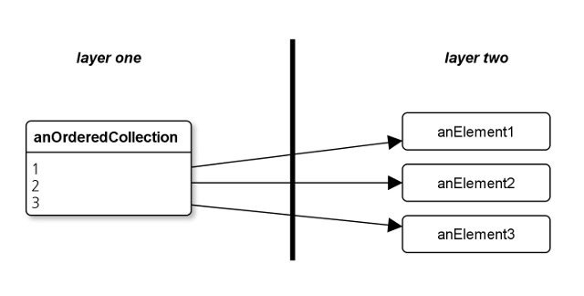 연결 리스트 또는 트리는 요소들을 모으는 하나의 방법에 불과한 듯 보일지 모르지만 이러한 연결 구조들은 대부분 Collection들이 구현되는 방식과는 꽤 다르다. 일반적인 Collection은 2층 구조로 되어 하나의 객체, Collection 자체가 구조 내에 어떤 요소들이 있는지를 알고 있다. 따라서 얼마나 많은 요소들이 있는지, 각 항목이 무엇인지 등을 쉽게 목록으로 만들 수 있다. 예를 들어, OrderedCollection과 그 요소들은 다음과 같이 연관된다: