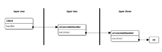 클래스 계층구조에 있는 메서드 룩업이 Chain of Responsibility가 어떻게 작용하는지를 보여주긴 하지만, 패턴의 고리가 클래스가 아닌 인스턴스의 고리여야 하기 때문에 패턴 자체로는 부족한 예제가 되겠다. 패턴의 두 번째 결과는, 고리가 런타임 시 역동적으로 변할 수 있다는 점이다 (DP 226). 클래스와 그가 구현하는 메서드는 런타임 시 정적인 경향이 있다; 컴파일 없이는 변하지 않는다. 진정한 Chain of Responsibility패턴을 나타내는 트리는 클래스 계층구조와 같이 컴파일 시간에 하드코딩된 것이 아니라 런타임 시 구축된 구조이다.