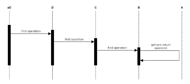 클라이언트가 operation 메시지를 D의 인스턴스 aD로 전송하면 B의 메서드를 어떻게 호출할까? 수신자 aD는 그의 클래스인 D에게 메시지 operation의 구현을 요청한다. D에는 operation 메서드가 없으므로 이 클래스는 그의 슈퍼클래스인 C에게 메서드의 구현을 요청한다. C도 operation의 구현 메서드를 갖고 있지 않으므로 그의 슈퍼클래스에게 요청한다. 마침내 operation의 구현을 찾은 B 클래스가 메서드를 리턴한다. C는 B로부터 받은 메서드를 D로 전달하여 최종적으로 메서드를 호출하는 aD로 전달된다. 이번 예제에선 operation의 구현부 요청이 A까지 전달되지 않기 때문에 A가 operation을 구현 가능한지 여부는 상관이 없다.