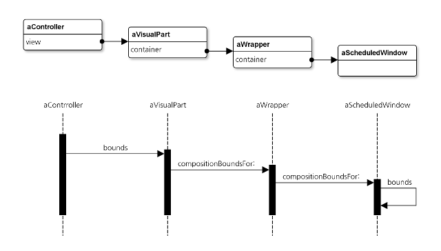 인스턴스 다이어그램은 VisualPart의 컨테이너가 nil이 아니므로 bounds가 컨테이너로 compositionBoundsFor: 를 전송하는 것을 보여준다. 컨테이너는 Wrapper로서, Wrapper는 VisualPart로부터 compositionBoundsFor: 를 상속받는다: