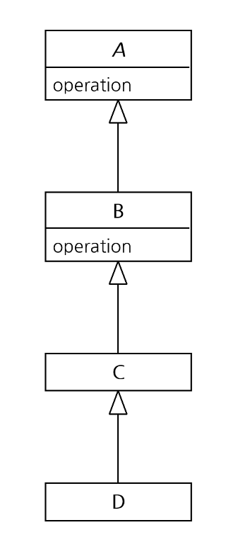 객체가 메시지를 수신하였는데 이에 대한 응답으로 실행할 메서드를 찾아야 한다고 가정해보자. (이는 메서드 룩업이 어떻게 논리적으로 행동하는지를 설명해준다.) 당신에겐 4개의 클래스가 있고ㅡA, B, C, DㅡD는 C의 서브클래스이고, C는 B의, B는 A의 서브클래스이다. B는 operation을 구현하고, C와 D는 그 구현을 변경하지 않은 채 상속한다고 치자 (다음 페이지 참조):