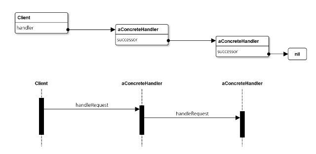 위의 그림은 Chain of Responsibility가 어떻게 작용하는지를 보여준다. 클라이언트 aD가 operation의 구현을 요청한다. 클라이언트는 그의 처리기 D로 요청을 전송한다. 요청을 스스로 처리할 수 없는 이 처리기는 다음 객체인 C로 요청을 전달하고, C는 다시 B로 전달한다. B 처리기는 요청을 처리할 수 있으므로 그렇게 한다. 요청 경로가 풀리면서 응답은 B에서 C, D, 그리고 요청을 한 클라이언트 aD까지 차례로 전달되어 실제로 누가 요청을 처리했는지도 모른 채 응답을 받는다.