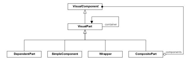 이제 비주얼웍스의 VisualComponent 계층구조에 있는 메인 클래스를 살펴보자. 컴포넌트 클래스는 VisualComponent이고, CompositePartSimpleComponent는 Composite 클래스, Leaf 클래스는 DependentPark와 SimpleComponent이다. 여기서 Wrapper가 흥미롭다; 사실상 Decorator (161) 패턴에서 Decorator 클래스이지만 다음 페이지에서 설명하는 바와 같이 Composite 클래스에서는 Leaf 클래스가 된다.