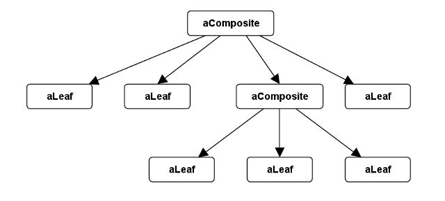 Composite 패턴의 비결은 두 개의 클래스이다: 하나는 단순 객체를 (또는 Leaf) 나타내고 나머지 하나는 객체 그룹을 나타낸다. 그룹 객체 또는 Composite는 그 행위를 그룹 내 객체로 위임함으로써 Leaf와 같은 역할을 한다. 두 클래스 모두 동일한 핵심 인터페이스를 지원하여 클라이언트로 하여금 교대하여 협력할 수 있게 한다. Composite은 그룹 멤버들이 Leaf 객체와 Composite를 모두 포함할 수 있기 때문에 공통 인터페이스를 기회로 활용한다. 하나의 Composite은 다른 Composite들을 비롯해 다른 객체들을 포함할 수 있으며 마지막 Composite들이 Leaf 이외에 포함하는 것이 없을 때까지 계속된다. 그 결과 Composite와 Leaf 객체의 트리가 만들어진다.
