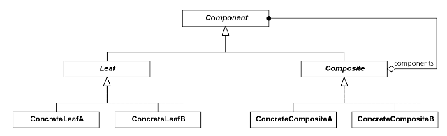 이보다 더 나은 해결책은 모든 구체적 Leaf 클래스에 대한 공통된 Leaf 슈퍼클래스이다. 이 슈퍼클래스는 주로 추상적 클래스이며 모든 구체적 Leaf 클래스에 공통된 코드를 구현하지만 이것은 Composite 클래스에는 적절하지 않다. 이와 유사한 방식으로, 복합 Composite 슈퍼클래스는 components 인스턴스 변수와 같은 구체적 Composite 클래스에 의해서만 상속되어야 하는 코드를 구현하는 데에 유용하다.