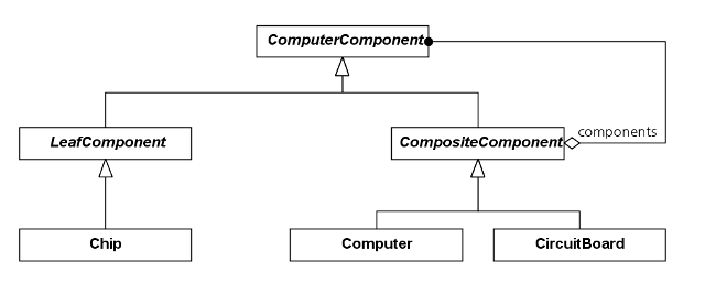 Composite 패턴을 제한 없이 사용하는 애플리케이션은 컴퓨터가 다른 컴퓨터를 포함시키고, 회로판이 컴퓨터를 포함시키며, 컴퓨터가 회로판에 속하지 않는 칩이나 회로판을 포함시킬 수 있도록 해준다 (따라서 어떤 칩이 장착되었는지 궁금할 것이다).