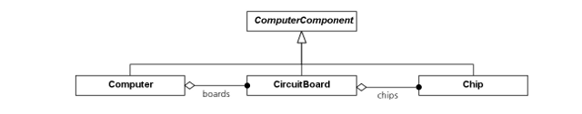 자신의 결정에 따라 다음과 같은 질문이 생길 것이다: Computer와 CircuitBoard는 얼마나 비슷하게 행동할까? 완전히 다른 객체인가 아니면 작은 컴퓨터 부품의 결합체에 불과한가? 답이 무엇이든 이것은 3개의 층으로 구성된 트리 구성이다. 각 층은 비슷하기 때문에 설계 상 비슷한 점을 포착하고 클라이언트 객체가 각 종류의 노드를 비슷하게 취급하도록 하며 코드 중복을 피하기 위해 Composite 패턴을 사용한다.