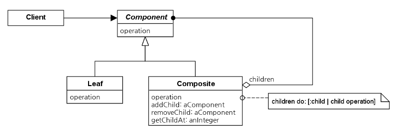 이에 따라 스몰토크에서 사용되는 Composite 패턴의 구조 다이어그램은 [디자인 패턴]에서 나타내는 구조와는 다르다. [디자인 패턴] 편의 Component는 Add(), Remove(), GetChild()와 같은 Composite 메시지를 구현한다. 스몰토크에서 패턴을 구현 시 Component가 주로 이러한 메시지를 구현하지 않는 이유는 모든 서브클래스에 적절한 메시지가 아니기 때문이다. 스몰토크에서 Component는 operation과 같이 모든 서브클래스에 적절한 메시지만 정의한다. 이러한 메시지들은 클라이언트가 투명하게 사용할 수 있는 유일한 메시지이다. Composite 메시지를 사용하기 위해 클라이언트는 먼저 그것이 아무 Component가 아니라 Composite와 협력하고 있는지를 결정해야 한다.