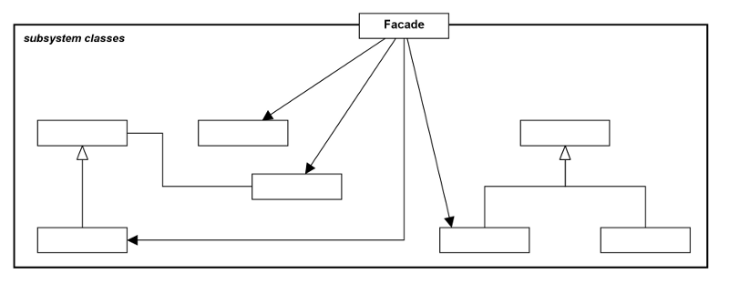 이 패턴에서 핵심은 하위시스템에 있는 객체로의 통일된 접촉지점을 제시하는 Facade 객체를 들 수 있다. Facade는 기반이 되는 클래스를 클라이언트에게 숨기면서 하위시스템으로 인터페이스를 제공한다.