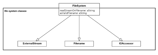 이 문제를 해결하기 위해 벤더의 파일 처리 프레임워크에 Facade 역할을 하는 FileSystem 클래스를 개발했다. 단순화된 인터페이스를 제공하여 공통된 여러 단계의 연산을 단일 메시지로 통합하였다 (절차성 추상화의 예제ㅡ비객체지향 언어에서도 가능하나 객체지향 프로그래머의 툴킷에 또 다른 중요한 도구임):