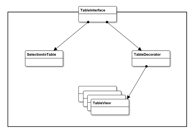 SelectionInTable은 TableDecorator에 붙어 있는 TableView에 대한 모델이다. TableInterface는 사용자가 이러한 연결을 구성할 필요가 없도록 하고, 둘을 동기화된 채로 유지하는 Observer 알림을 유지하지 못하도록 한다. 또한 TableView들 사이의 Observer 연결을 숨긴다. TableView는 라벨의 텍스트를 제공하는 문자열 집합체와 테이블 내의 행 라벨과 열 라벨을 나타낸다. 이러한 클래스의 인스턴스들 간 관계를 아래 다이어그램에서 나타내고자 한다:
