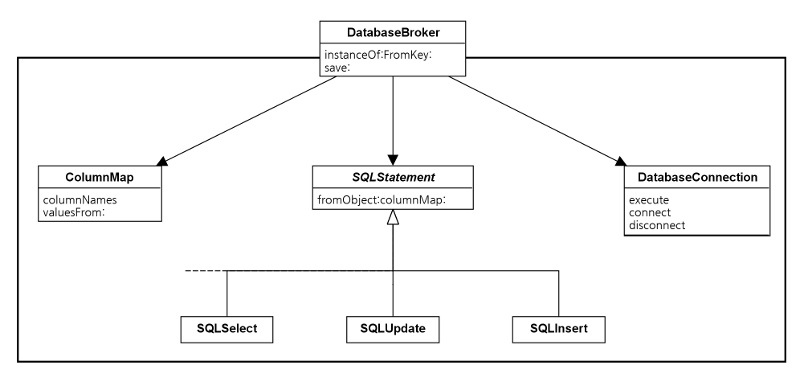 어떻게 작용하는지 알아보기 위해 DatabaseBroker 안의 save: 메서드를 살펴보자. 이것은 Facade 내의 메서드로서 객체들을 하위시스템 내부로 모은다. Facade의 클라이언트는 이 메서드가 객체들을 데이터베이스에 저장한다는 사실만 알면 된다; 하위시스템에 관한 자세한 내용은 무관하다.