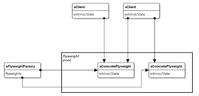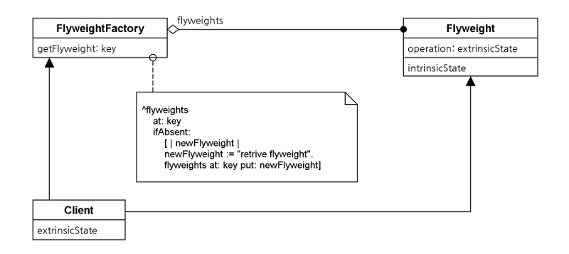 FlyweightFactorysms 기존 인스턴스를 flyweight pool에 보관한다. 이 pool은 flyweights 집합체 변수, FlyweightFactory 내부의 인스턴스 변수로서, Flyweight 인스턴스를 참조로 사용한다. FlyweightFactory를 Flyweight의 클래스 측에 구현할 때 인스턴스 변수는 클래스 측 변수가 된다.