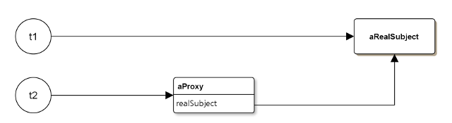 Flyweight와 Flyweight로의 Proxy는 주로 혼합되어 사용되지 않는다. 아래 그림과 같이 두 개의 변수가 동일한 객체를 가리키고 있다고 치자. 첫 번째 변수 t1은 주제대상(subject)인 aRealSubject를 직접 가리킨다. 다른 변수 t2는 프록시인 aProxy를 통해 간접적으로 주제대상을 가리킨다. 코드는 두 변수 모두 동일한 주제대상을 가리키고 있는지 어떻게 알까?