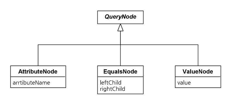 이는 우리의 쿼리 언어에서 가장 단순한 부분, 즉 동일성 검사 문제로 옮겨간다. 우리는 언어에서 aspectName = someValue 형태의 문장을ㅡ예: city = ‘Cleveland’ㅡ해석하길 원한다고 가정하자. Interpreter 패턴을 이용해 우리는 다음 클래스 계층구조를 구현함으로써 문장을 다음과 같이 처리할 수 있다: