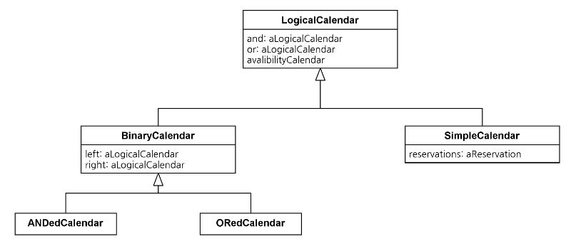 이 메소드는 사실상 노드로 이루어진 파스 트리를 구성한다. 가용성 달력에게 스스로를 평가하도록 요청하면 재미있는 부분이 발생한다. 이번 경우, 컴포넌트 부분에서 가용성 달력을 구성함을 의미한다. ANDedCalendar와 ORedCalendar는 이 구성에서 서로 다른 작업을 수행한다. ORedCalendar는 좌측과 우측 달력에서 자원에 대한 concatenation을 리턴할 것이다. 반대로 ANDedCalandar는 좌측과 우측 달력의 결과를, 오른쪽에 가능한 시간 슬롯을 왼쪽의 것과 순열(permutation)시킨 결과에 결합한다. 따라서 최상위 단계에는 ResourceScheduler가 노동자, 기계, 도구의 모든 가능한 조합의 집합을 수신하며, 그것의 규칙들은 "최고의" 조합을 평가할 수 있다.