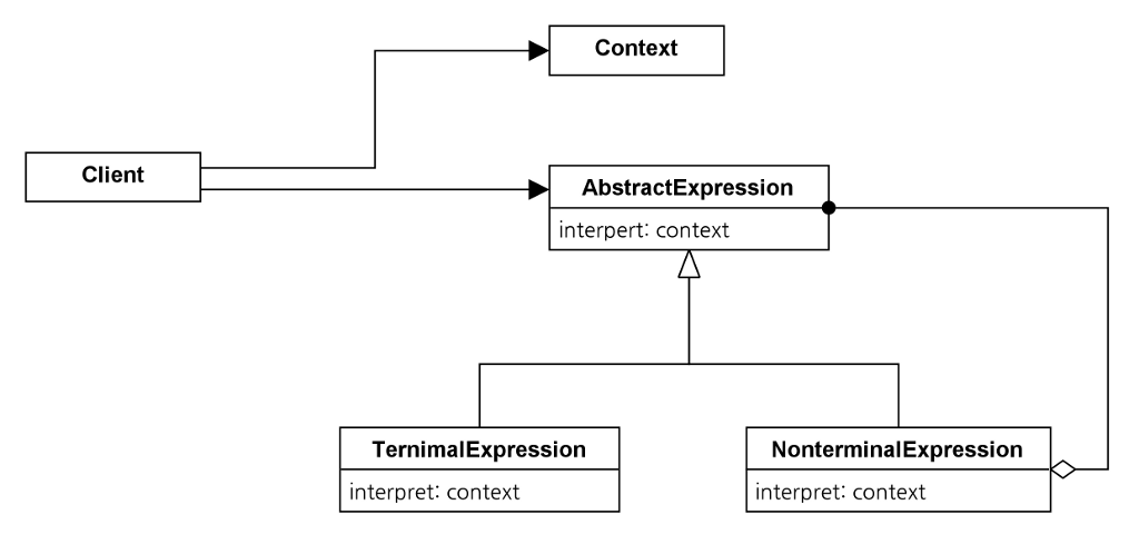 Interpreter 패턴의 핵심은 어떠한 문(statement)이든 단순한 언어로 표현하기 위해 하나의 트리로 구조화할 수 있는 표현식(Expression) 객체의 집합이다. 이러한 Expression들은 서로 다른 타입의 Expression을 위한 서브클래스를 가진 AbstractExpression 계층구조의 인스턴스들이다. 각 Expression은 스스로를 해석하여 결과로 나타내는 값을 리턴할 수 있다. 일부 표현식은 변수와 같을 수도 있다; 그리고 값은 트리가 최근 해석된 Context에 따라 달라진다. 따라서 해석을 요청하는 Client는 이 해석에 Context를 제공해야 하는 경우도 있다.
