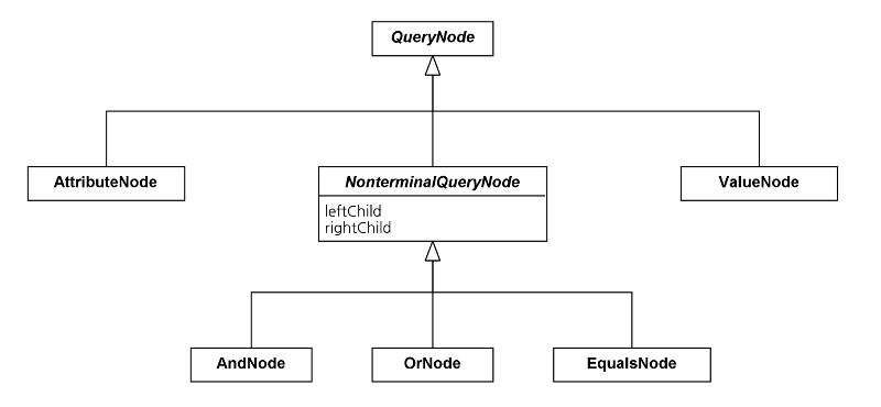 이러한 새로운 디자인은 단말 노드와 비단말 노드 사이가 단순히 구분되는데, 각 비단말 노드는 좌측과 우측에 자식을 하나씩 가진 이진 노드이다. 이는 NonterminalQueryNode 클래스를 추가함으로써 이루어진다. 이 클래스의 서브클래스들은 자식 노드를 표현하기 위해 인스턴스 변수 rightChild와 leftChild를 상속한다.