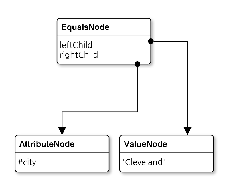 EqualsNode는 두 개의 자식을 가진다. 이것은 anObject에 대해 평가한 후 그 결과에서 동등성을 비교한다:
