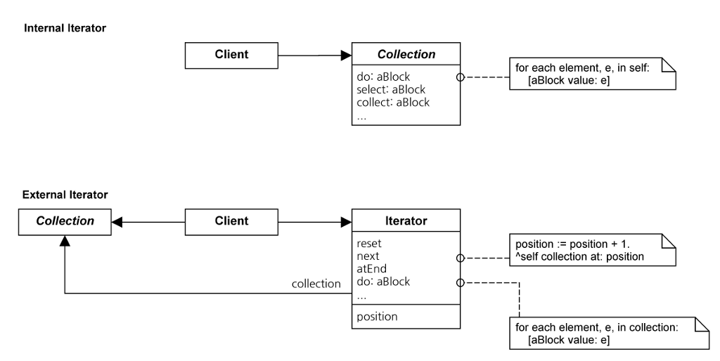 - 내부 Iterator 대 외부 Iterator. 내부 Iterator 대신 외부 Iterator의 사용을 선택해야 할 때는 언제일까? 외부 Iterator를 사용하는 중요한 이유는 메서드들간 공유가 쉽고 객체들 간 전달이 쉽기 때문이다. 외부 Iterator는 클라이언트에게 iteration에 대한 정밀한 통제력과, 하나의 클라이언트 메서드에 단일 위치로부터 전송된 1회성 내부 반복 메시지 대신 필요 시 다수의 코드 위치로부터 iteration 단계를 호출하는 기능을 제공한다. 스몰토크에서 찾아볼 수 있는 또 다른 근거로는, 외부 Iterator Stream 클래스들이 수많은 문자열 조작 메서드를 제공한다는 것을 들 수 있다.
