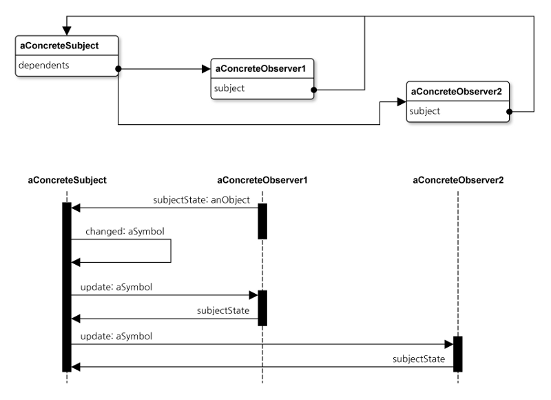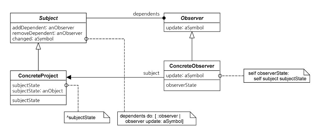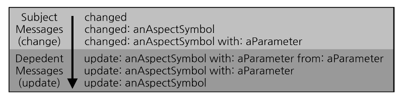 • update:with:from: ㅡ어떤 주제대상이 변경을 알렸는지 종속자가 알아야 하는 경우 종속자는 이 메시지를 구현한다. 세 번째 파라미터 aSender는 변경 알림을 전송한 주제대상이다.