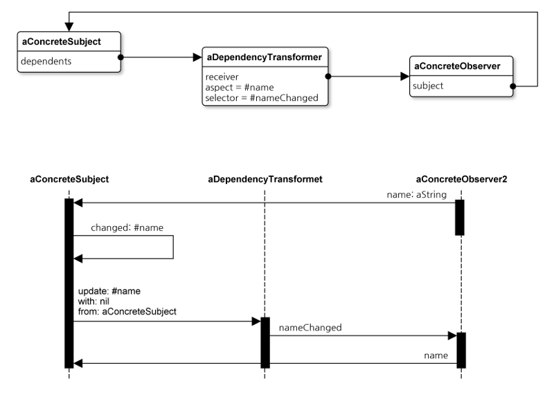 어떤 객체도 주제대상이 될 수 있으므로 어떤 객체든 DependencyTransformer를 가질 수 있다. 아래에서 나타내듯 DependencyTransformer를 생성하는 메시지는 expressInterestIn:for:sendBack: 이며 의존성을 깨는 메시지는 retractInterestIn:for: 이다. 두 개의 메시지는 DependencyTransformer를 대상의 종속자로 만들기 위해 addDependent: 와 removeDependent: 를 사용한다: