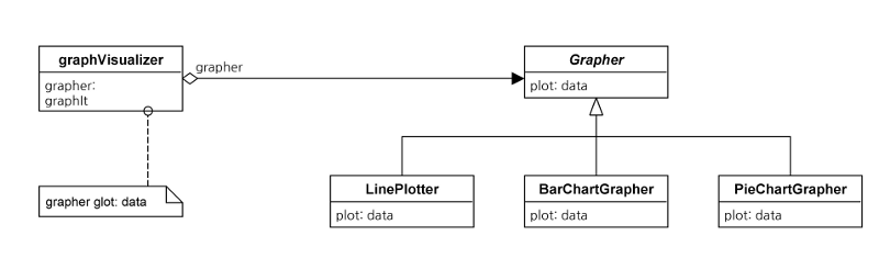 Grapher는 추상 슈퍼클래스로서 (현재) 3개의 구체적 서브클래스를 가진다. 사용자가 파이 차트로 정보를 표시하길 요청하면 GraphVisualizer는 PieChartGrapher를 인스턴스화하고 그 인스턴스를 자신의 grapher 객체로 설치한다. 선 그래프와 막대 도표도 마찬가지다. 그래프를 그려야 하는 상황이 오면 GraphVisualizer는 자신의 grapher에 업무를 수행하라는 메시지를 전송한다.