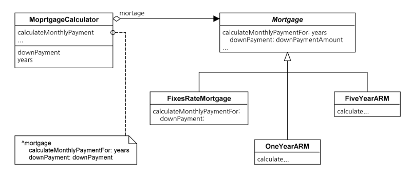 사용자가 대출 유형을 선택하면 Mortgage 서브클래스 중 하나가 인스턴스화된다 (ARM은 변동금리 모기지를 의미한다). 월별 지급액을 결정하기 위해 Mortgage 인스턴스 자체가 애플리케이션의 Strategy 객체 역할을 하여 알고리즘적 계산을 수행한다. 알고리즘의 선택은 대출 유형의 선택과 일치한다. 따라서 다른 책임을 가진 도메인 특정적 객체는 Strategy의 역할을 할지도 모른다.