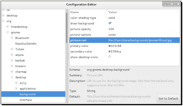 스크린샷을 보면 org.gnome.desktop.background 에 다수의 엔트리가 있으며, 그 중 하나는 데스크톱 배경 이미지의 URI를 포함하는 picture-uri임을 확인할 수 있다.