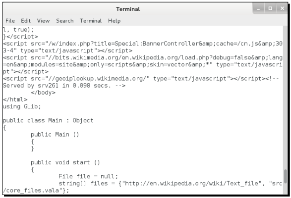 본문에 소개된 예제의 경우 처음엔 file.read 함수로부터 스트림을 얻는다. 데이터를 쉽게 읽도록 이 스트림을 GDataInputStream으로 전송한다. 새로운 스트림을 이용해 어떤 내용도 찾지 않을 때까지, 즉 파일 끝에 도달할 때까지 데이터를 읽을 것을 GIO에게 요청한다. 이후 데이터를 화면으로 출력한다.