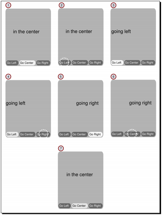 목업을 좀 더 가까이 살펴보자. 첫 번째 애플리케이션 상태는 이미지 번호 1로 표시된다. 이는 중앙으로 정렬된 라벨과 세 개의 버튼을 표시하는데, 가운데 버튼은 누름 상태로 되어 있다. 이미지 번호 2는 사용자가 첫 번째 버튼을 클릭함을 보여준다. 이미지 번호 3은 애플리케이션의 반응을 표시한다. 이미지가 왼쪽으로 이동하였고, 버튼 상태는 누름 상태로 변경되었음을 확인할 수 있다. 또 중간 버튼의 상태는 일반 상태로 설정되었음을 확인할 수 있다. 다음 이미지를 따라 끝까지 가면 애플리케이션에서 가능한 상호작용을 모두 갖게 된다.