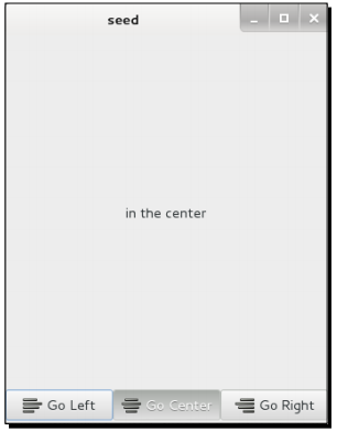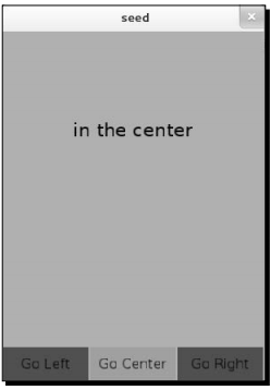 radiobutton1 버튼이 토글되면 시그널 핸들러 go_left 함수가 호출된다. radiobutton2의 경우 go_center가 호출되고, radiobutton3이 토글되면 go_right가 호출된다. radiobutton2의 경우 활성화(active)로 초기화해야만 목업의 초기 상태와 일치한다.