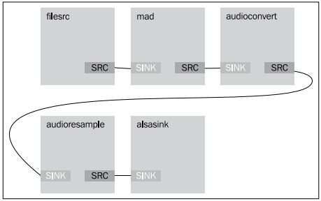 이를 통해 bass.mp3 파일을 열고 싶다는 사실을 요소에게 알리는 셈이다. 또 filesrc 요소를 mad 요소로 연결한다. 그 다음으로는 mad 요소를 converter 요소로 연결함으로써 연결 작업을 계속한다.