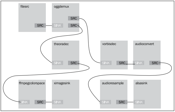 앞의 그림에서는 파일로부터 스트림이 Ogg 디멀티플렉서에 의해 두 부분으로 나뉨을 확인할 수 있다. 그 결과 소스 스트림은 오디오와 비디오 모두를 포함한다. 비디오 스트림은 theora 디코더와 색상 공간 변환기로 전달된다. 이러한 플러그인은 미디어로부터 비디오 내용을 디코딩하는 데 사용된다. 그리고 나면 ximage 싱크로 전달된다. 이는 디코딩된 자료를 화면에 표시하기 위함이다. 오디오 스트림은 vorbis 디코더로 전달된 후 오디오 변환기와 resampler 요소로 전달된다. vorbis 플러그인은 미디어에서 오디오 내용을 디코딩하는 데 사용된다. 이후 오디오를 사운드카드에서 재생하도록 alsa 싱크로 전달한다.