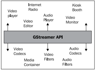 그림에서 볼 수 있듯이 애플리케이션은 GStreamer가 제공한 APIs를 사용할 수 있고, 특정 코덱이나 필터의 구현에서도 API를 사용할 수 있다. 애플리케이션은 코덱이나 필터에 대한 세부적인 내용을 알 필요가 없으며, 코덱이나 필터 또한 애플리케이션의 세부 내용을 알 필요 없다. 불행하게도 실제 세계에서는 그림에 표시된 모든 것을 스스로 구현하는 동시 서로 차이가 있는 오디오 및 비디오 재생 애플리케이션들이 존재한다.
