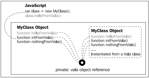 이를 위해서는 백엔드 객체를 JavaScriptCore 클래스와 함수 정의로 자동 줄바꿈(wrap)한다. 프론트엔드에서 이용 가능하게 만들고자 하는 객체마다 JavaScriptCore 측에서 매핑을 생성해야 한다. 아래 그림에서는 MyClass 객체 다음 helloFromVala 함수를, 그 다음으로 intFromVala 순으로 매핑한다.