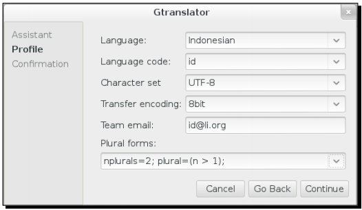 4. 처음으로 시작할 때 프로파일을 채울 필요가 있다. 프로파일에 이름을 제공하고 본인의 이름과 이메일 주소를 채워라. 다음 창에서는 번역하고자 하는 언어 프로퍼티에 대해 질문할 것이다. 언어 코드가 올바른지 확인하라 (ISO-639 참고). 문자 집합으로 UTF-88bit 를 입력하고 인코딩 값을 각각 전달하라. Team email 은 이 언어의 번역가가 사용하는 이메일 주소다. Plural forms 옵션은 단어가 복수 형태를 어떻게 사용할 것인지 결정한다. 인도네시아어에서 복수의 개수는 2이고, 단어가 참조하는 객체의 계수가 1보다 크면 단어는 복수 형태를 사용할 것이다. 따라서 nplurals=2; plural=(n>1) 옵션을 선택한다. 인도네시아어의 경우 아래와 같은 모습이 될 것이다.