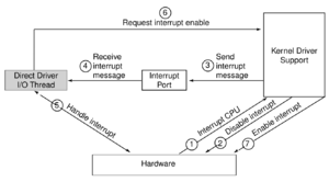 Most kernel-level drivers don't handle interrupts directly. Instead, the kernel notifies the driver of an interrupt by sending a Mach message to the interrupt port. An interrupt port is allocated when a direct driver object is initialized by the attachInterruptPort method of IODirectDevice. Figure 2-2 shows how interrupts are handled by the kernel and the I/O thread of a direct device driver.