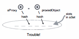 이 시나리오는 가능성이 적어 보이지만 객체 자체를 대신해 객체에 대해 보통 프록시(proxy)를 사용하는 클라이언트/서버 시스템에서 발생한다. 어떤 프록시가 어떤 객체를 의미하는지 결정하기 위해 시스템은 프록시와 객체에서 문제와 관련된 자료를 (사회보장번호 또는 기타 유일한 식별자) 비교하는 오버라이드된 동등성 검사(overridden equality test)를 사용한다. 프록시와 그 객체는 동일하진 않지만 동등하다고 할 수 있는데, 동일하게 식별되는 자료를 갖고 있기 때문이다. 그러면 시스템은 프록시와 그 객체를 동일한 것처럼 취급하는데, 이는 동등성을 오버라이딩한 목적이다. 하지만 시스템을 "사라지는 요소의 변칙"에 노출하기도 한다. 프록시와 프록시된 객체의 서로 다른 해시 결과는 두 객체에 대해 다른 위치를 명시한다: