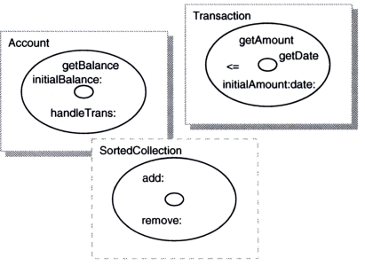 SortedCollection을 둘러싼 점선은 Date와 마찬가지로 카드나 클래스가 이미 스몰토크에 존재하기 때문에 새 카드나 클래스를 보장하지 않음을 의미한다. 따라서 Account와 Transaction 두 개의 클래스만 작성하면 되겠다. 메서드가 argument로서 기대하는 객체의 유형은 시각적 편의를 위해 그림에서 생략하였는데, 아래와 같다: