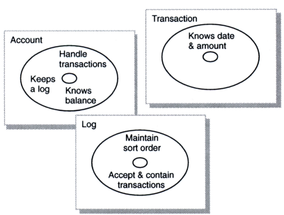 "account가 log를 갖도록 만드는" 관계에 부여하는 추상화 수준-디자인 또는 분석-조차 결정에 도움이 되지 못한다. 어떤 것도 관계를 두 개의 추상화 수준에서 표시되지 못하도록 방해하지 않는다. 사실 객체 지향 방법론에서 객체와 그 관계는 주로 하나의 단계에서 다음 단계로 서서히 지속된다. 이렇게 내재적인 모호함에도 불구하고 분석, 디자인, 구현 단계를 구별하려는 시도는 습관적으로 이루어진다. 따라서 주로 84 페이지 도표에 있는 책임 카드를 디자인 단계로, 85 페이지 도표에 있는 스몰토크 스타일의 메서드명은 구현 단계로 돌리곤 한다.