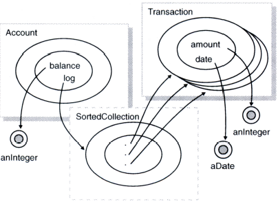 "transactions를 포함해야 하는" 로그의 책임은 어떤가? 우선 스몰토크가 우리를 위해 이미 구현해놓은 SortedCollection 클래스를 재사용할 예정이기 때문에 사실상 이 책임을 이행하기 위한 상세(details)는 염려할 필요가 없다. (그럼에도 불구하고 정렬된 컬렉션과 같은 컨테이너의 내부에 관해 할 말이 있다. 컨테이너는 이름을 가진 인스턴스 변수를 이용해 컨테이너 내부에 있는 각 객체를 설명할 수 없다. 따라서 스몰토크 컨테이너에는 불특정한 수의 이름이 지정되지 않은 인스턴스 변수가 존재하고, 그러한 변수의 수는 컨테이너로 객체를 추가하거나 그로부터 객체를 제거할 때마다 증가 또는 감소하는 것으로 보인다.)