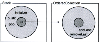 인스턴스 변수 oc 는 스택으로 하여금 그것이 구매하는 정렬된 컬렉션으로 접근할 수 있도록 해준다. 스택에 꼭 필요한 메서드로 push:pop 이 있다. 그들의 코드는 단순히 인스턴스 변수에게 요청을 보내고 정렬된 컬렉션으로부터 적절한 메서드를 구매한다. 따라서 푸싱(pushing)의 경우 아래가 되고: