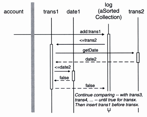 SortedCollection 의 인스턴스에 해당하는 로그(log)는 기본적으로 비교 메서드 <=를 이용해 정렬한다. 그것으로 새 transaction 을 추가하면 이는 새 transaction 을 삽입할 올바른 위치를 찾을 때까지 transaction 에게 자신을 (<=를 이용해) 이미 존재하는 transactions 에 한 번에 하나씩 비교하도록 요청한다. 이러한 새 transaction 은 자신을 다른 transactions 와 비교하기 위해 무엇을 사용할까? 고유의 일자를 이용하여 그것을 다른 transaction 의 일자와 비교한다. 일자가 transactions 내부에 캡슐화된다는 점은 정적 정보의 핵심이다. 로그는 transactions 를 포함하고, 각 transaction 는 자신의 일자를 캡슐화하며, transactions 는 캡슐화된 일자로 접근하기 위해 getDate getter 를 (종종 date 라고 불림) 갖는다는 사실을 유념하라. 이 모든 정보는 정적이다. 이러한 정보를 모두 엮은 상호 작용 다이어그램은 다음과 같다: